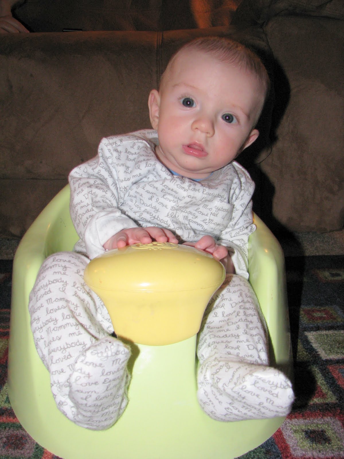 Lucas is 4 months...I can hardly believe it. He fits into 0-3 month clothes still, except for most pants. He is too tall for them, but the 3-6 month pants are so big around his waist. He still fits in some newborn onesies. He is still such a great baby. He sleeps 9-10 hours at night and is on a really good schedule during the day. I know when he is going to eat and sleep and I can plan my day around it. He stays awake between his evening feedings and is so funny. He makes lots of noises and loves chatting with us.